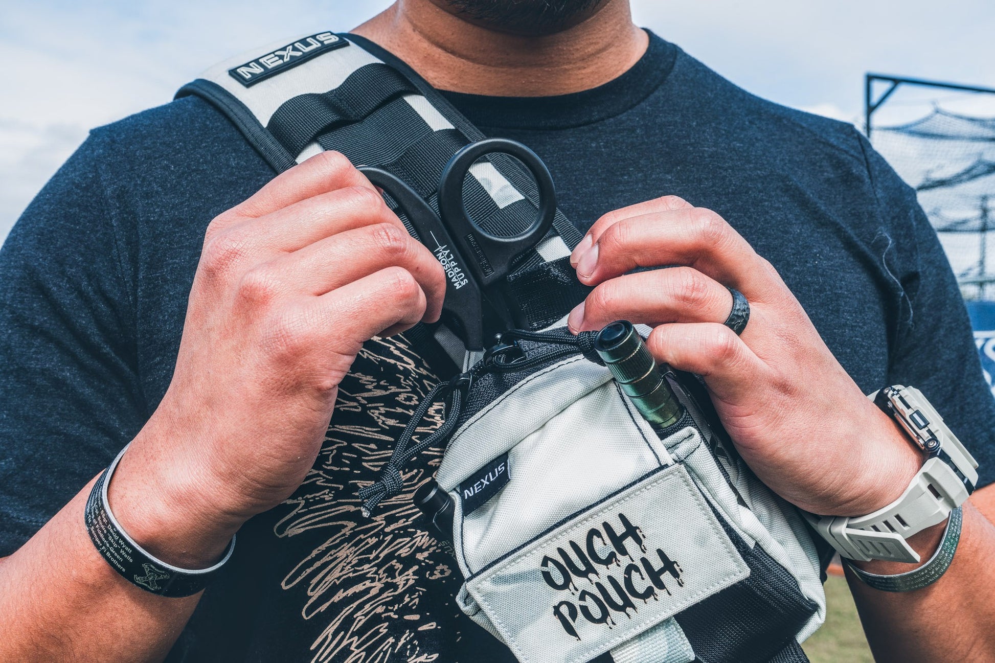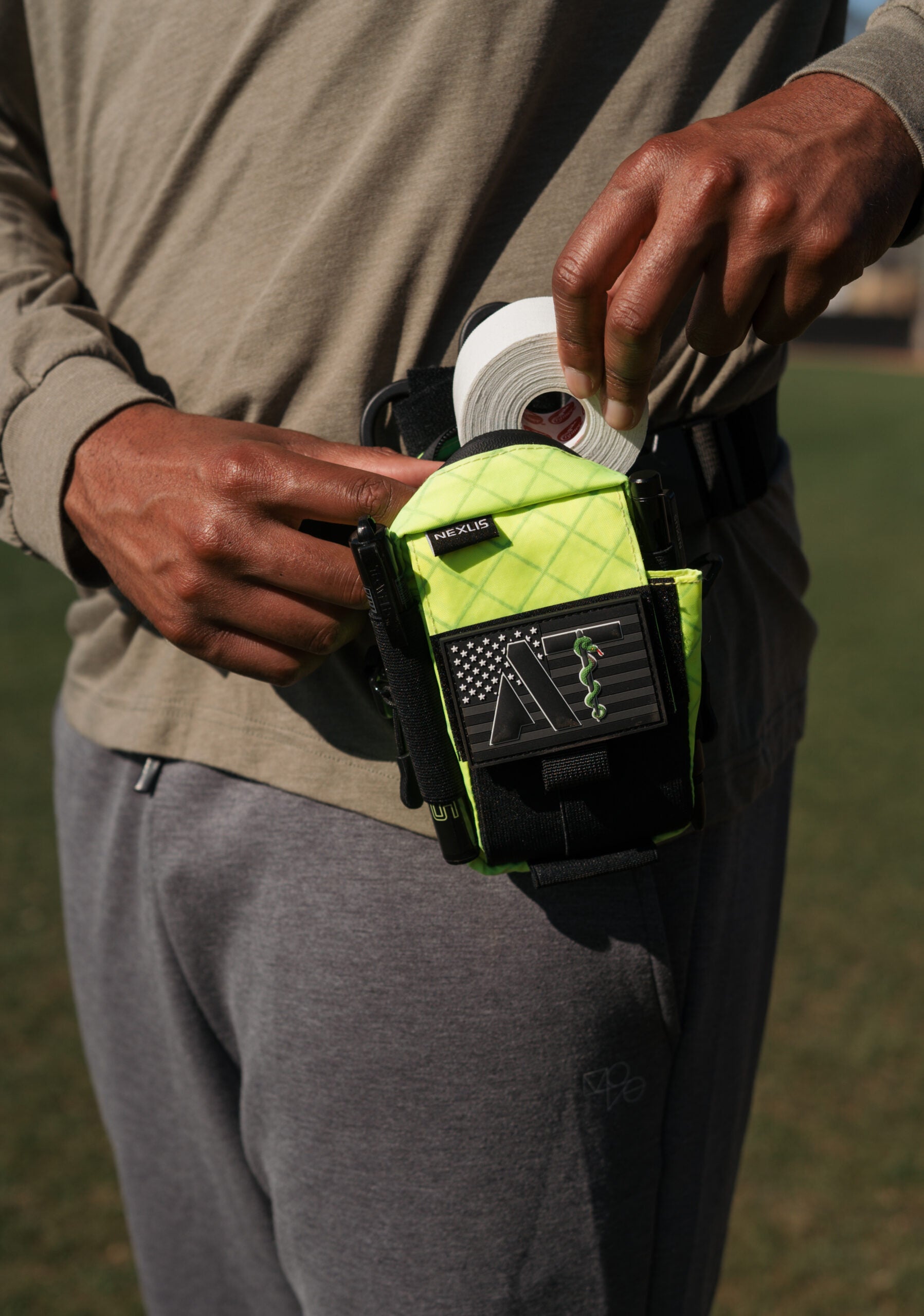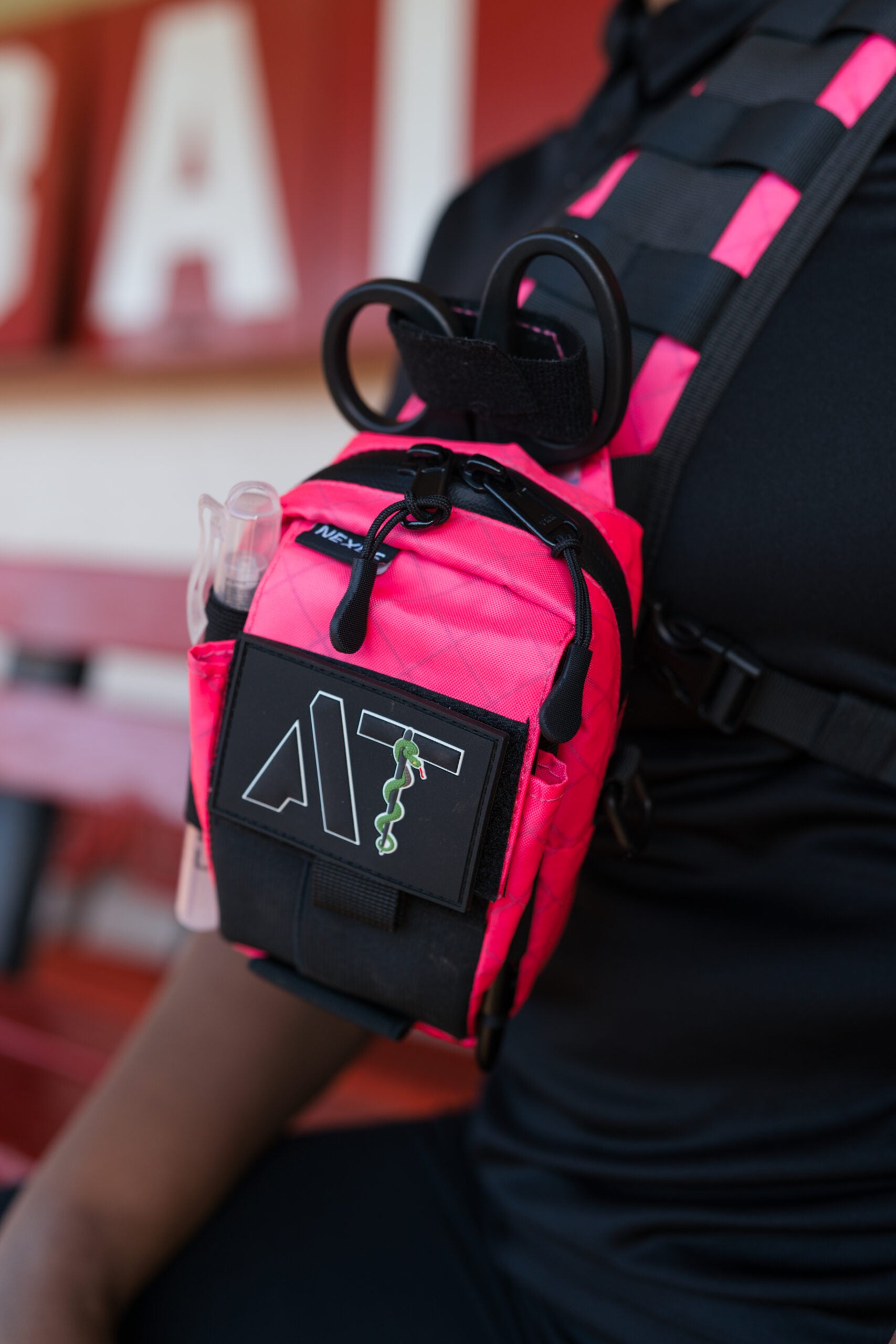The pouch has an integrated elastic glove pouch for immediate access that is divided by another pocket to store other small items in the flap pocket. The main zipper compartment is tall and wide enough to hold 2 full rolls of tape. On the back, there is scissor retention and a pocket that is compatible with the SuperPro, Leatherman Raptor, and almost any scissor on the market.