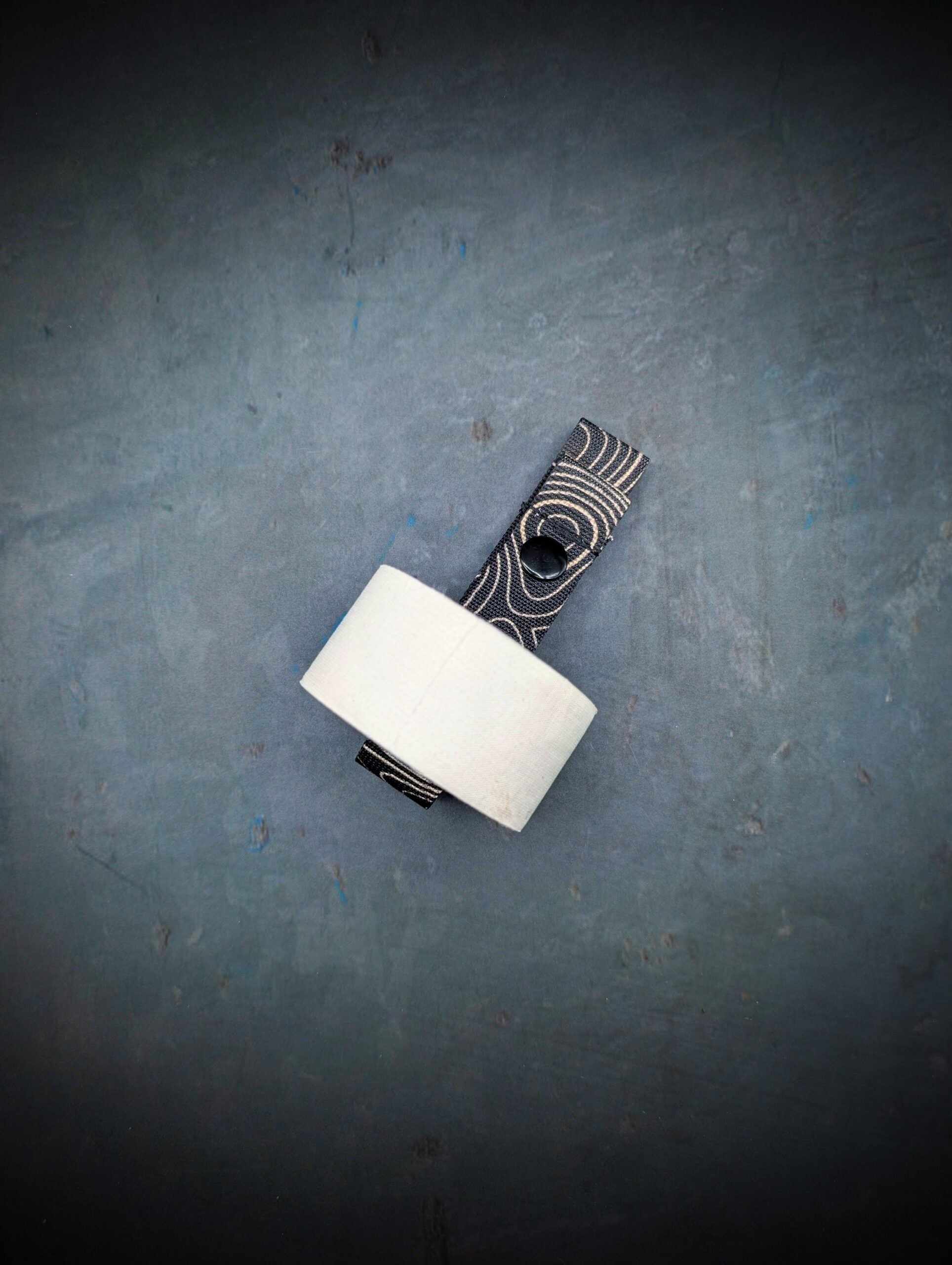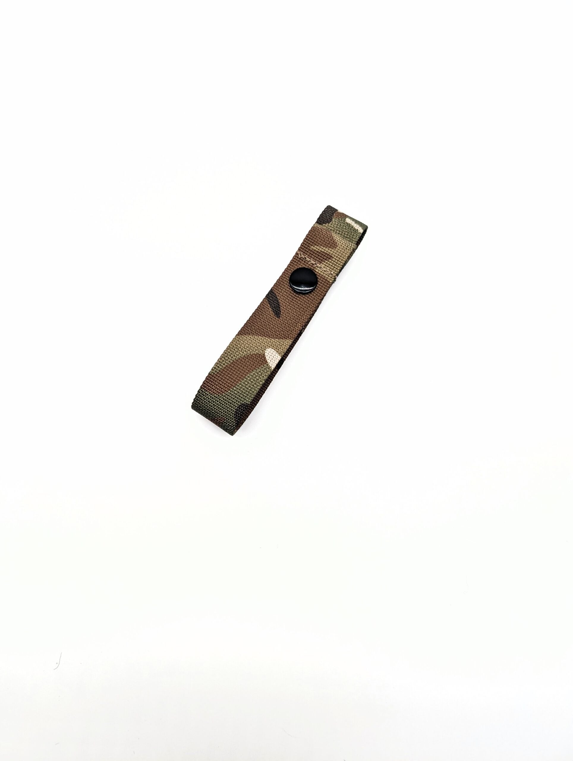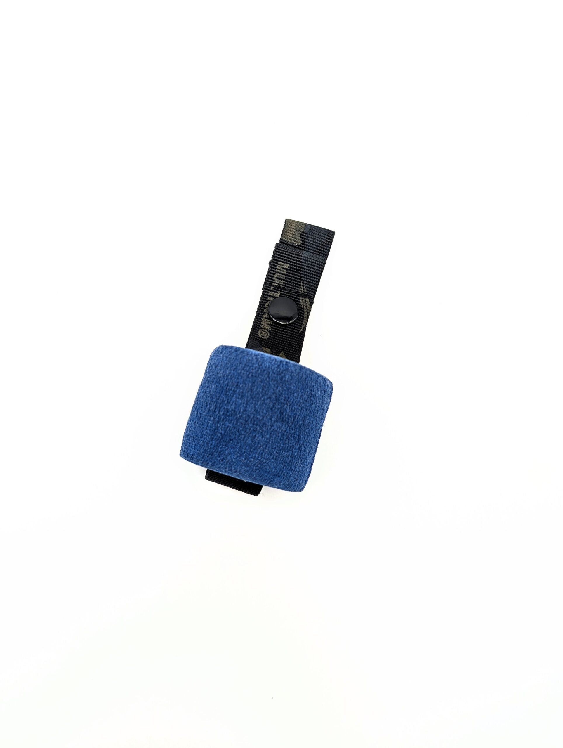 Our design features a folded webbing tab that keeps the holder in place with snap buttons for quick release to grab your tape when needed.
