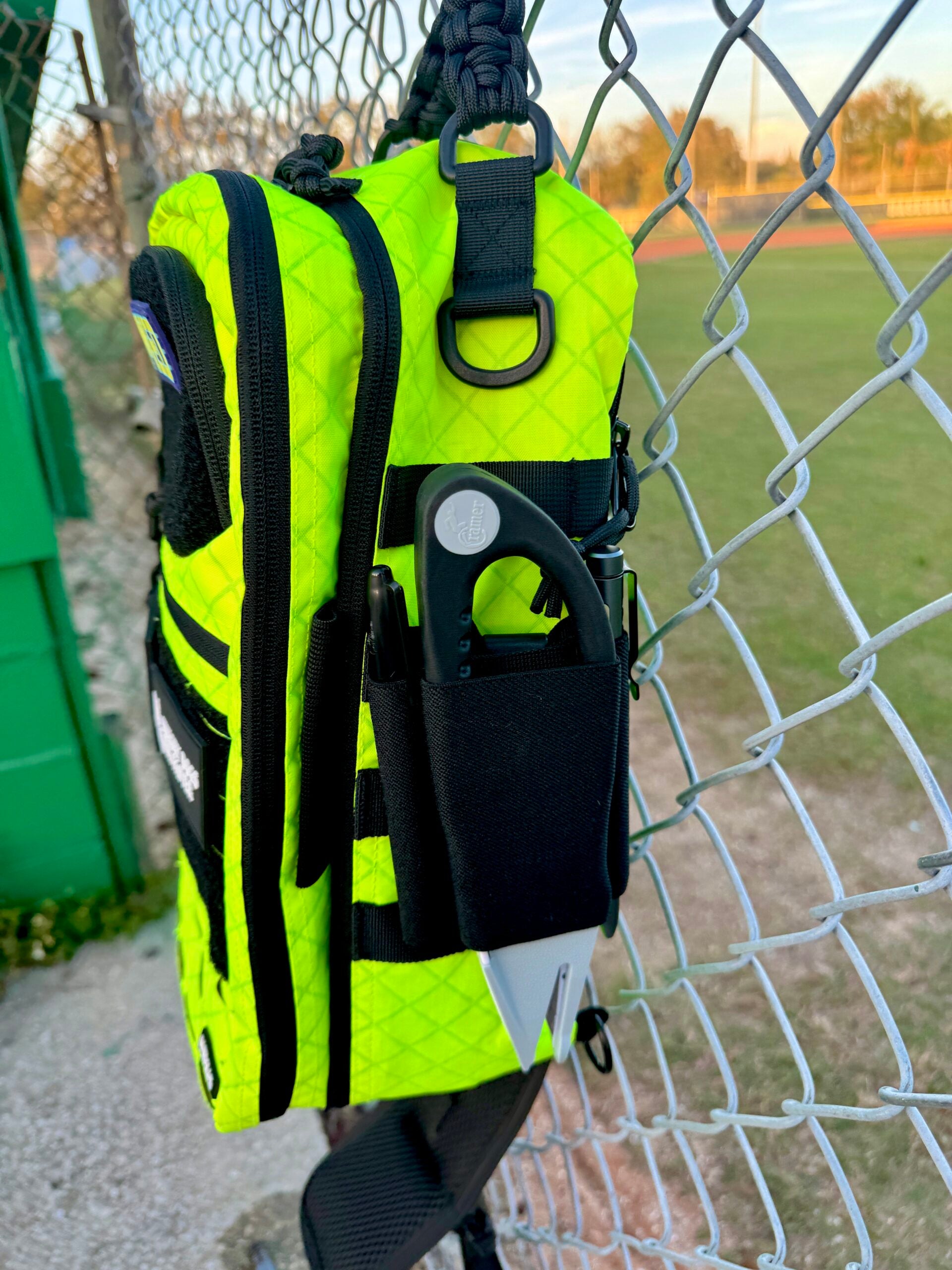 Behind the elastic slot is a built in scissor slot that is SuperPro compatible and can fit most EMT shears. The Leatherman Raptor WILL NOT fit in the scissor slot.